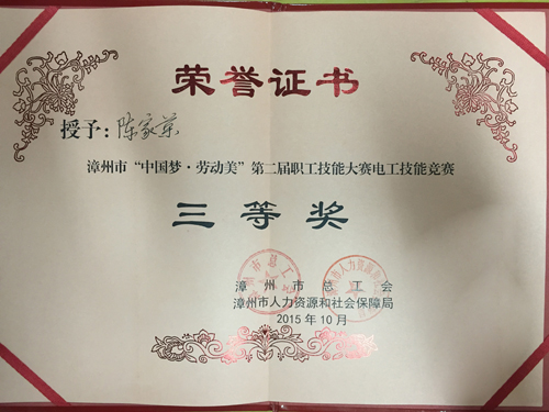 2015年10月28日,為期2天的漳州市“中國夢?勞動美” 第二屆技能大賽維修電工技能競賽圓滿落下帷幕。黃忠灼、游照輝、陳家榮、許志榕、楊文遠、李源森等6名員工代表公司參加競賽。他們在競賽中發(fā)揮出了自己的水平,其中陳家榮榮獲三等獎。