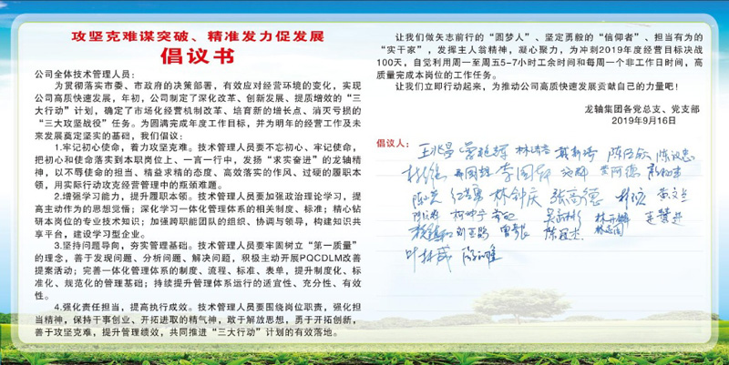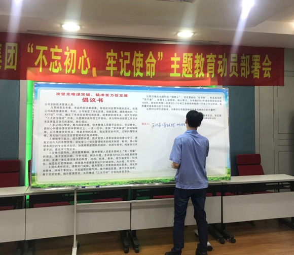 2019年9月16日,公司各黨總支、黨支部在二樓會議室開展 “攻堅克難謀突破、精準發(fā)力促發(fā)展”倡議書簽名活動。航空事業(yè)部黨支部書記王兆昌代表公司各黨總支、黨支部向全體技術(shù)管理人員發(fā)出倡議:一要牢記初心使命,著力攻堅克難;二要增強學習能力,提升履職本領(lǐng);三要堅持問題導向,夯實管理基礎(chǔ);四要強化責任擔當,提高執(zhí)行成效。號召全體技術(shù)管理人員做矢志前行的“圓夢人”、堅定勇毅的“信仰者”、擔當有為的“實干家”,發(fā)揮主人翁精神,凝心聚力,為沖刺2019年度經(jīng)營目標決戰(zhàn)100天,自覺利用周一至周五5-7小時工余時間和每周一個非工作日時間,高質(zhì)量完成本崗位的工作任務(wù)。最后,各黨總支(支部)書記依次在倡議書上簽字。