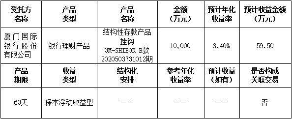 • 本次委托理財金額:委托廈門國際銀行理財10,000萬元。