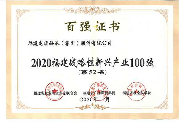 2020年11月20日,2020福建企業(yè)100強(qiáng)發(fā)布大會(huì)暨福建企業(yè)家大講壇在寧德市舉辦。會(huì)上,福建省企業(yè)與企業(yè)家聯(lián)合會(huì)聯(lián)合、福建省社會(huì)科學(xué)院、福建省廣播影視集團(tuán)聯(lián)合發(fā)布的“2020福建戰(zhàn)略性新興產(chǎn)業(yè)領(lǐng)軍企業(yè)100強(qiáng)”榜單中,福建龍溪軸承(集團(tuán))股份有限公司位列榜單第52名。