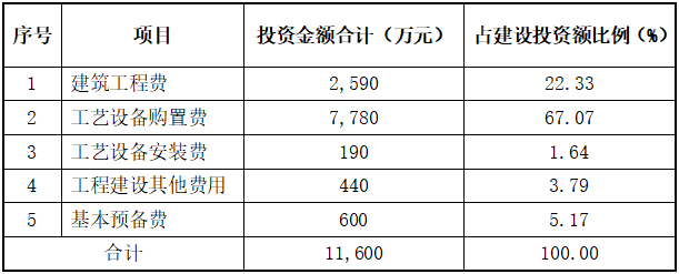 項(xiàng)目總投資15,500萬元,其中:建筑工程費(fèi)2,590萬元,工藝設(shè)備購置費(fèi)7,780萬元,工藝設(shè)備安裝費(fèi)190萬元,工程建設(shè)其他費(fèi)用440萬元,基本預(yù)備費(fèi)600萬元,鋪底流動資金3,900萬元。