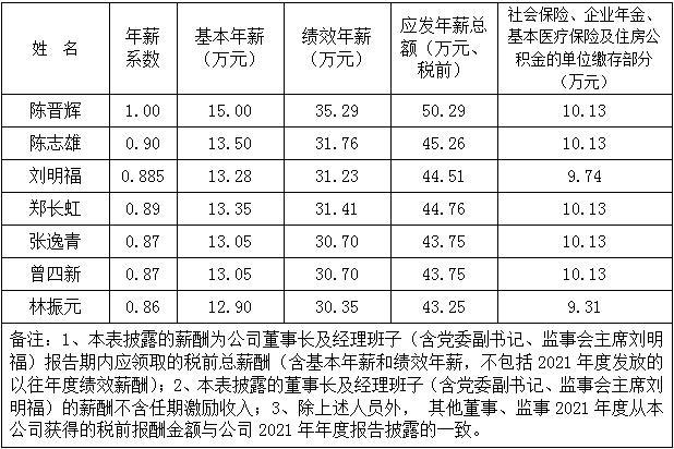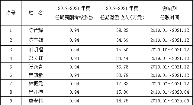 根據(jù)漳州市國資委及《公司董事長、經(jīng)理班子年薪方案》的有關(guān)規(guī)定,同意公司董事長及經(jīng)理班子人員(含黨委副書記、監(jiān)事會主席劉明福)2021年度薪酬方案修訂如下: