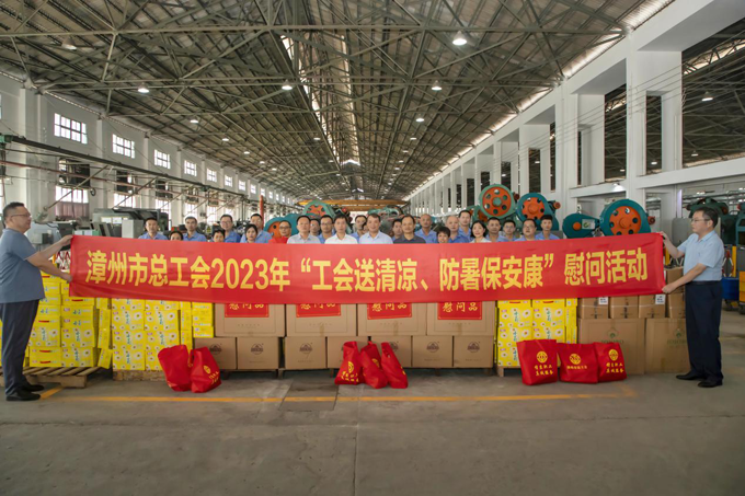 2023年7月14日,漳州市總工會黨組書記、常務副主席張哲青,黨組成員、工會副主席曾景賢帶領漳州市總工會慰問團蒞臨龍軸集團開展“工會送清涼、防暑保安康”慰問活動。龍軸集團黨委書記、董事長陳晉輝,黨委副書記、工會主席劉明福參加慰問。