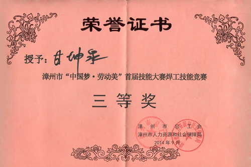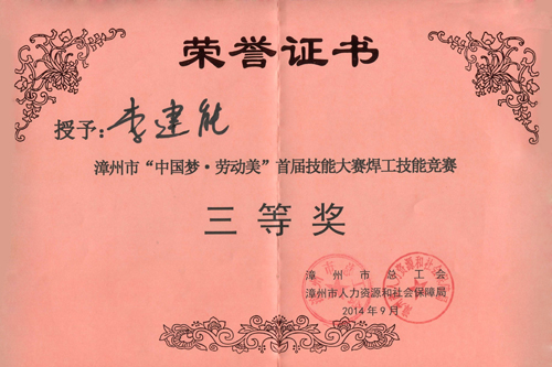2014年9月24~25日,福建龍溪軸承(集團(tuán))股份有限公司派出6名員工參加了漳州市“中國夢·勞動(dòng)美”首屆職工技能大賽焊工技能競賽,甘坤泉與李建能二名選手在緊張激烈的角逐中脫穎而出,榮獲三等獎(jiǎng)。
