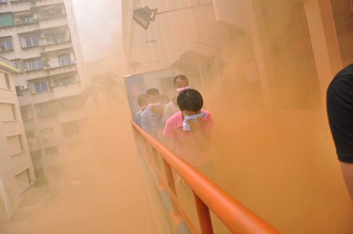 在闕教官講解相關(guān)消防知識(shí)和消防器材使用方法、傳授消防逃生應(yīng)變技能和自我保護(hù)技能及明確各演練職能小組職責(zé)和演練小組疏散路線之后,演練開(kāi)始。滅火行動(dòng)組在得到演練命令后,立即發(fā)出火警訊號(hào),并在各指定點(diǎn)放啟煙霧彈,樓梯道和走廊瞬間頓時(shí)濃煙滾滾。各演練組聽(tīng)到逃生訊號(hào)后,在應(yīng)急疏散隊(duì)的組織下,按組分批迅速有序地從俱樂(lè)部二樓往一樓籃球場(chǎng)疏散撤離,每人用濕毛巾捂住嘴巴,彎腰匍匐前進(jìn),按規(guī)定的順序疏散,直到?jīng)_出煙區(qū)。